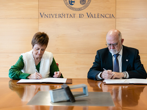 La Rectora Magnífica de la Universitat de València, María Vicenta Mestre, y el presidente del Muy Ilustre Colegio Oficial de Farmacéuticos de Valencia, Jaime Giner, han firmado hoy el Convenio de Colaboración