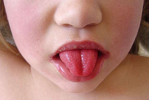 También presenta enrojecimiento en la mucosa de la faringe, con puntos de pus en el fondo de la garganta y amígdalas. La lengua se cubre con una capa blanquecina y una inflamación de las papilas que, cuando desaparece la capa, da un aspecto de “frambuesa” a la lengua.