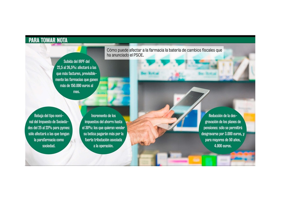 El programa económico que ha propuesto recientemente el PSOE supondrá una subida masiva de impuestos que, de llevarse a cabo, afectaría de lleno a los titulares de la oficina de farmacia, sobre todo a los que hacen más caja. Para conocer el impacto de los cambios tributarios planteados por el Gobierno, CF ha consultado a expertos fiscalistas que han desmenuzado las consecuencias de la puesta en marcha de estas medidas para la factura fiscal de la oficina.