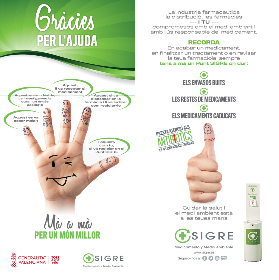 SIGRE ha puesto en marcha, para este otoño en la Comunidad Valenciana, la campaña ‘Gràcies per l’ajuda’. Esta iniciativa está destinada a sensibilizar a la población para colaborar en el correcto reciclado de los envases vacíos o con restos de medicamentos, depositándolos en el Punto SIGRE de las oficinas de farmacia.