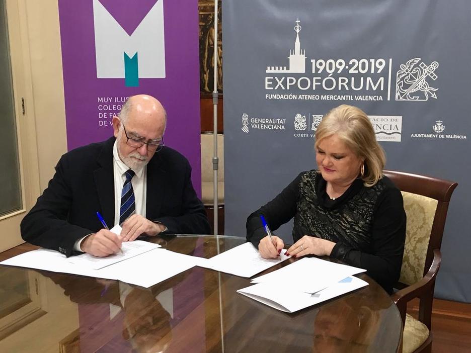El presidente del MICOF, Jaime Giner, ha firmado esta tarde un convenio de colaboración con la presidenta de la Fundación Ateneo Mercantil de la Comunitat Valenciana, Carmen de Rosa, con el fin de participar en la celebración de “Expoforum 2019”.