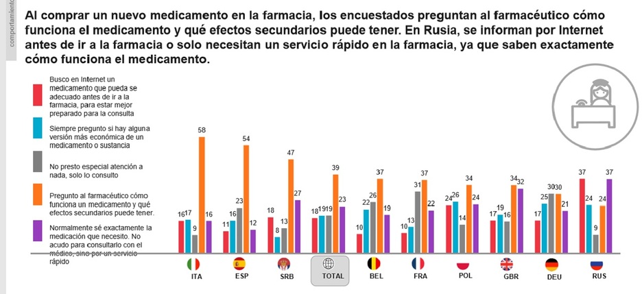 En cuanto al recurso de Internet para disipar dudas («Doctor Google»), sólo un 18 por ciento de los europeos emplea esta forma de consulta, siendo España, Bélgica y Francia los países que menos recurren a la red, frente a otros como Rusia. Eso sí, el estudio añade que “cuando la consulta médica o la farmacia más cercana está a muchos kilómetros de distancia, la web suele ser la única fuente de información”.