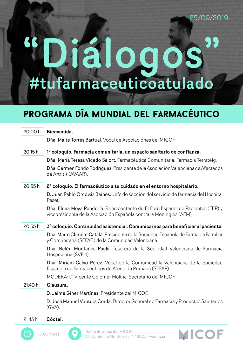 Este acto, que tiene como objetivo conmemorar con todos los colegiados del MICOF nuestro día y poner de relieve el papel que ejerce el farmacéutico en todas sus vertientes, estará compuesto por tres coloquios en el que participarán representantes de las asociaciones de pacientes de la Comunidad Valencia y profesionales farmacéuticos del ámbito comunitario, hospitalario y asistencial.