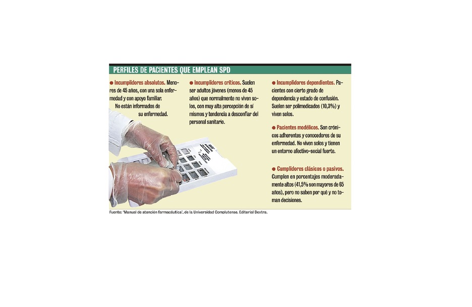 En su capítulo clasifica a los pacientes de SPD en cinco tipos: “Nos hemos basado en bibliografía, estudios científicos de la Fundación Pharmaceutical Care y de la Sociedad Española de Farmacia Familiar y Comunitaria (Sefac) y en nuestra experiencia personal”, explica.