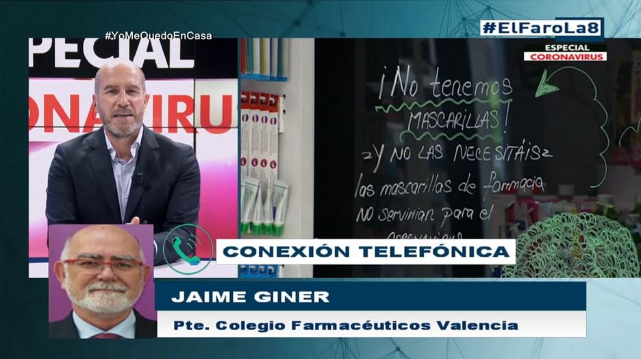 El presidente del MICOF, Jaime Giner, intervino el pasado miércoles por noche en el programa "El Faro" de Ocho TV, para hablar de la falta de productos como gel hidroalcohólico, guantes o mascarillas, como afrontan los farmacéuticos la crisis sanitaria y sus exigencias para dar un servicio en condiciones al paciente.