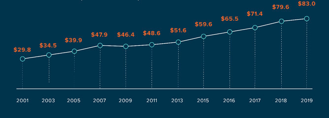 Las farmacéuticas asociadas a la patronal norteamericana PhRMA –tanto las de origen estadounidense como las extranjeras que operan en el país- volvieron a batir el récord de inversión en I+D en 2019, año en el que entre todas destinaron 83.000 millones de dólares a esta actividad. La facturación del sector, sin embargo, cayó un 7,5% en ese mismo ejercicio; la mayor caída experimentada en las últimas cuatro décadas de las compañías a las que representa la citada organización, que publica su análisis anual respecto al ejercicio anterior revelando en este caso una tendencia del sector previa a la llegada de la pandemia por SARS-CoV-2.