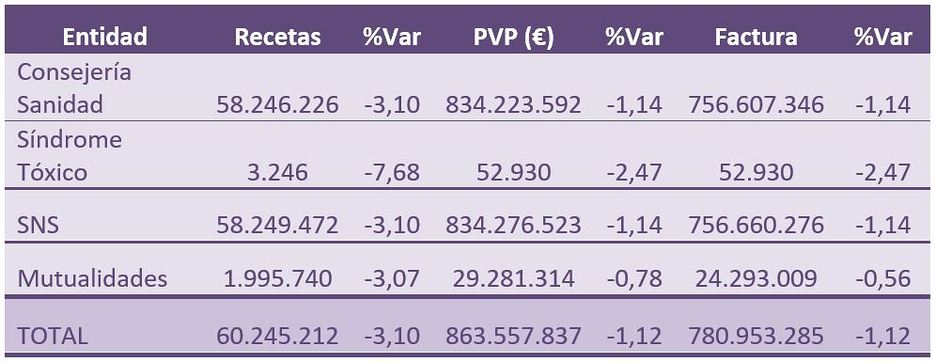 En términos interanuales, la facturación pública decrece solo un (-1,1%), Ya         que las recetas por farmacia descienden un (-3,1%), que hace que el importe de la factura pública de la provincia de Valencia sea de 780,9 millones de euros, sumando mutualidades y SNS, incluidas las recetas a beneficiarios del síndrome tóxico.