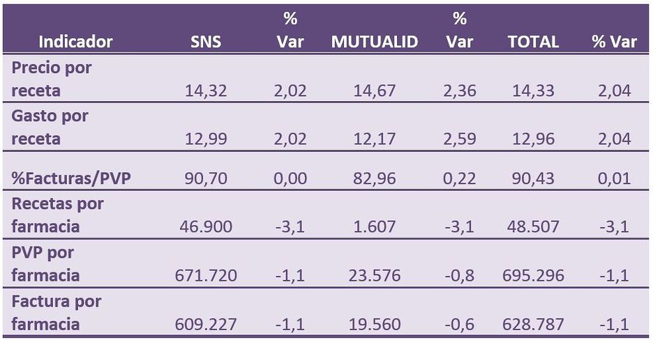 La factura por oficina de farmacia en los últimos 12 meses se eleva así hasta los 789,9 euros, un (-0,12%) menos que el año anterior. El  gasto público por receta de 12,96 euros es el único indicador que aumenta. Descienden las recetas por farmacia y el % que representan las facturas es el 90,43 del PVP, ya que el resto son aportaciones y descuentos.