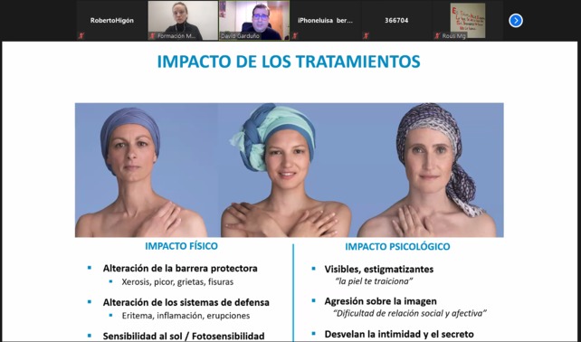 Los cuidados dermocosméticos de enfermos oncológicos es el tema que ha centrado el webinar que ha celebrado esta tarde a través de la plataforma ZOOM en el que farmacéuticos y también pacientes se han informado sobre conocimientos básicos en los cuidados dermatológicos y cosméticos en personas con cáncer.