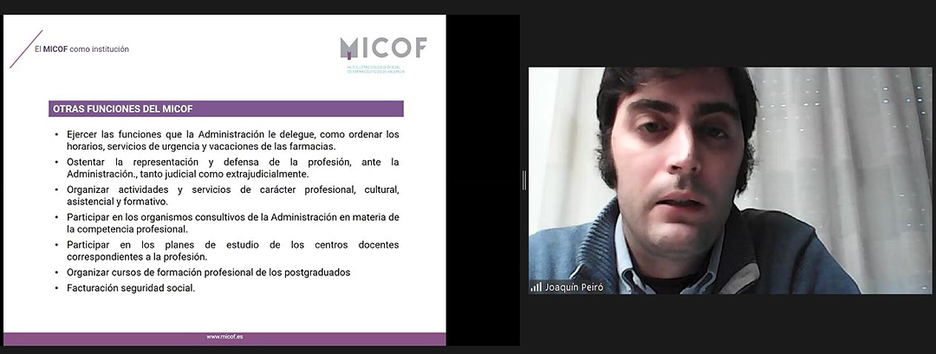 Después, Joaquín Pieró ha regresado a la sesión virtual para informar sobre precolegiación, bolsa de empleo y las diferentes salidas profesionales a las que puede optar un graduado en farmacia. Para finalizar la visita online, Julián Navas, responsable del departamento de ortopedia del MICOF, ha hablado sobre el valor añadido de la ortopedia mientras que, Óscar García, farmacéutico del CIM, lo ha hecho sobre los servicios profesionales que pueden ofrecerse desde las oficinas de farmacia.