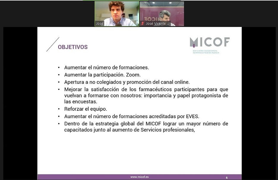 A continuación, José Sendra, vocal de Formación, junto con Cristina Prieto, farmacéutica del CIM y del departamento de formación del Colegio, han profundizado en la oferta formativa de la que dispone el MICOF, así como del plan de formación previsto a lo largo de todo este año 2021 en el que, lógicamente, se aprovecharán al máximo las plataformas digitales para la realización de webinars y talleres digitales. En este sentido, José Sendra ha recordado que la formación de los profesionales farmacéuticos no finaliza con la carrera de farmacia, sino que se trata más bien “de un punto y seguido para seguir creciendo tanto a nivel profesional como formativo”. Es por ello, que el Colegio ofrece cada año diversidad de cursos adaptados a las necesidades de los farmacéuticos y de manera que puedan compatibilizarse con la jornada laboral u otros factores.