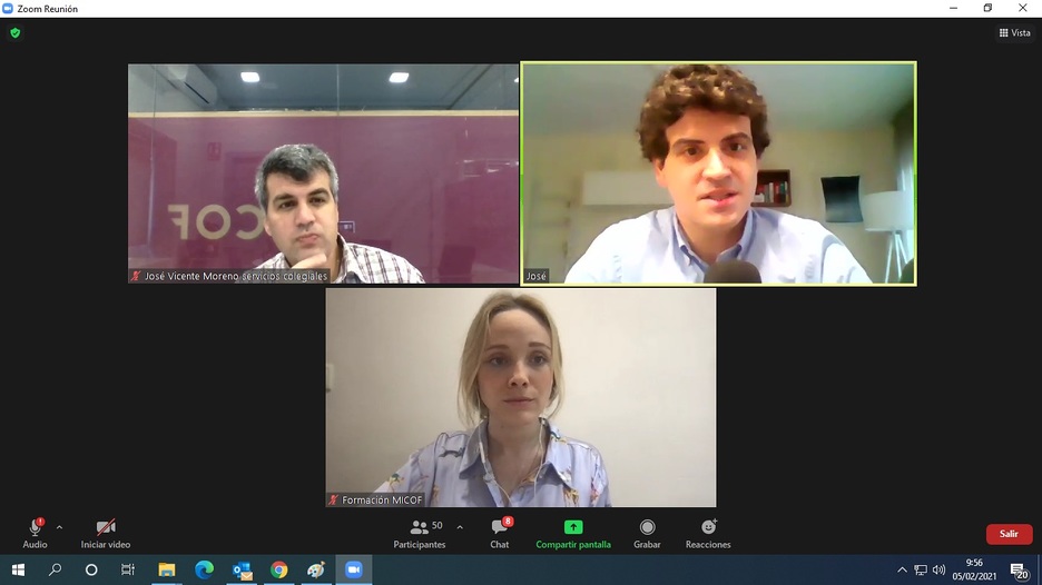 Tras el recibimiento virtual a los estudiantes, Jose Vicente Moreno, del departamento de colegiación, ha sido el encargado de explicar todos aquellos servicios que ofrece el MICOF y de los que pueden beneficiarse los colegiados.