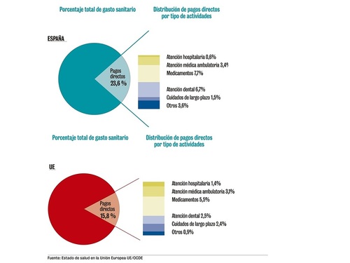 El informe Estado de salud en la Unión Europea, señala que España gasta menos en sanidad que la media de la Unión Europea: un 8,9 % del PIB, frente al 9,8 %, según datos de 2017.