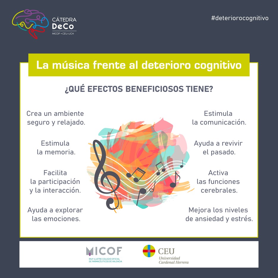 Se ha observado un beneficio en pacientes con deterioro cognitivo cuando se complementa la terapia farmacológica con musicoterapia, es decir, cuando se usa la música con fines terapéuticos. Esto es debido a que la música crea un ambiente seguro en el cual el paciente se siente relajado y vuelve a conectar consigo mismo.