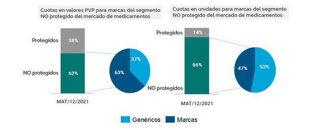 En el año 2021 los medicamentos protegidos supusieron el 38% de las ventas an valores mientras los no protegidos fueron el 62% de las ventas.