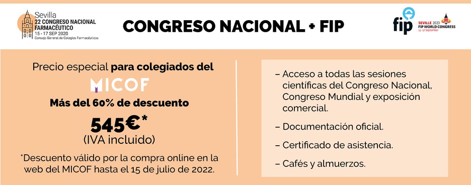 El MICOF ha adquirido packs de inscripciones para que los colegiados interesados puedan disfrutar del 62% de descuento en la entrada conjunta para asistir a la celebración en Sevilla del 80 Congreso Mundial de Farmacia y al 22 Congreso Nacional Farmacéutico:
