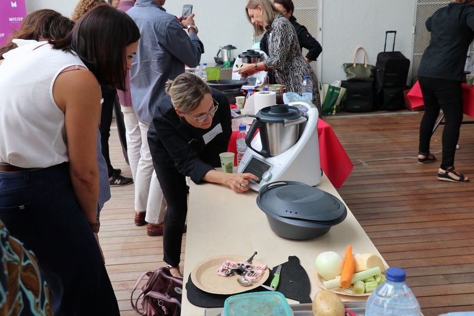Tras las ponencias de la mañana se dio paso a una sesión práctica de cocina en directo llamada Farmachef en la que los asistentes pudieron aprender técnicas de cocina saludable mediante robots de cocina y la elaboración de un menú compuesto por un entrante, un plato principal y un postre, acompañado de un zumo natural.