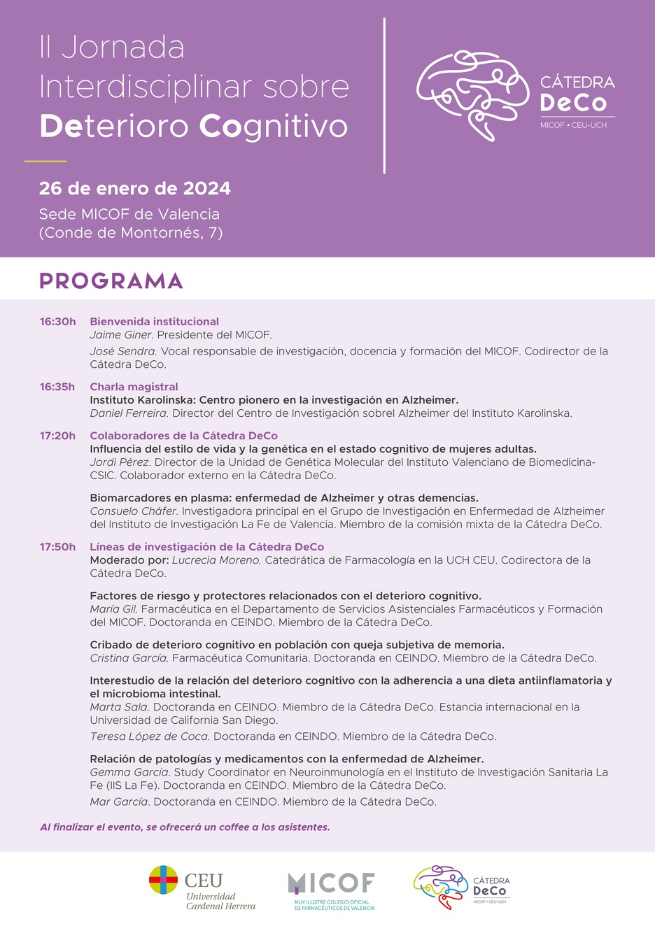 El objetivo de esta jornada es ofrecer a los asistentes unas charlas magistrales sobre demencia y deterioro cognitivo y dar a conocer las distintas líneas de investigación de la Cátedra DeCo.