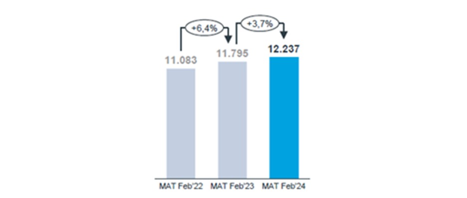 Tomando como fuente la información facilitada por la consultora IQVIA podemos observar que el mercado total de medicamentos está creciendo a buen ritmo en el mes de febrero del año 2024, aunque mucho menos que el crecimiento que tuvo entre los años 2022 y 2023