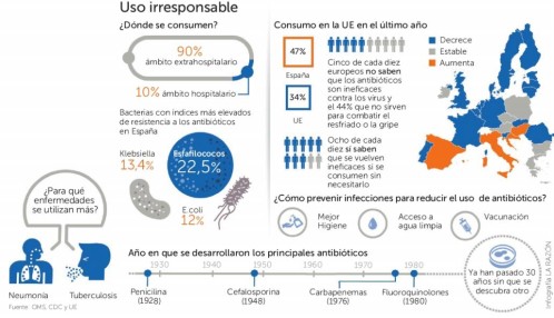 José Luis Cañada, coordinador del Grupo de Infecciosas de Semergen (Sociedad Española de Médicos de Atención Primaria) lo tiene claro: «Los antibióticos se usan mal. En muchas ocasiones se utiliza como medicina preventiva porque creemos que lo cubre todo y no es así». Esto explica por qué España se sitúa entre los cinco países europeos con mayor consumo y en la segunda posición en ventas de antibióticos veterinarios. Y eso que contamos con un Plan Nacional para reducir el riesgo de resistencia a estos fármacos. De acuerdo con Cañada, «de cada diez infecciones que padecemos, nueve no precisan de antibióticos», pero se consumen.