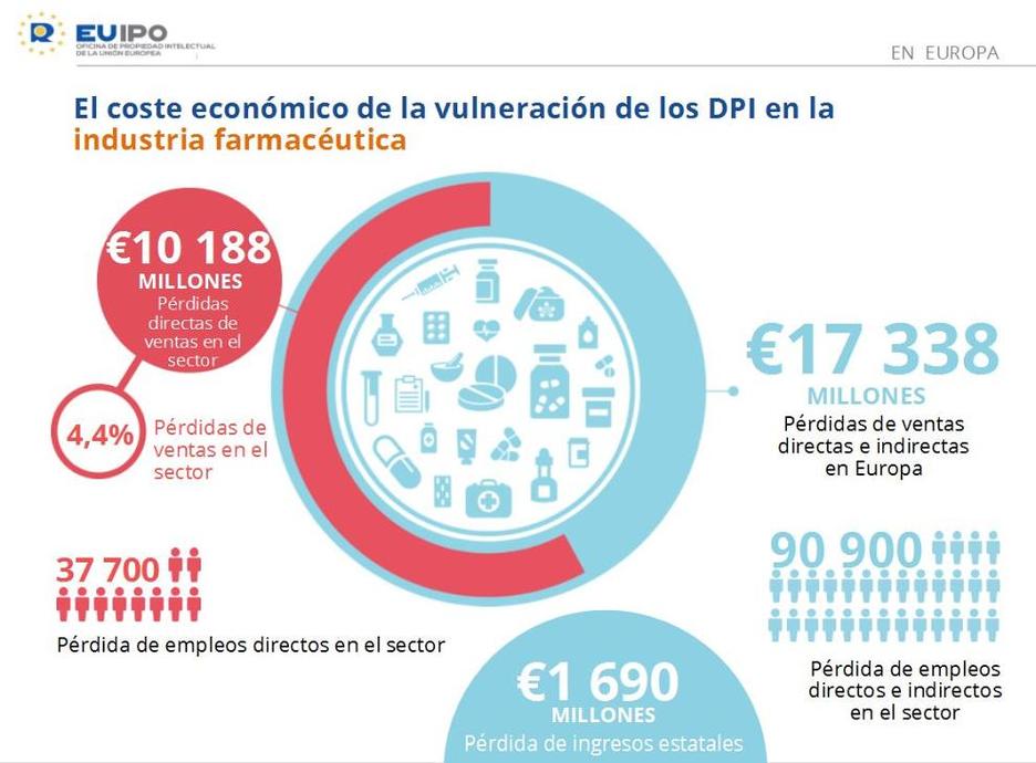 Los medicamentos falsos le cuestan al sector farmacéutico de la Unión Europea (UE) unos 10.200 millones de euros cada año, lo que representa el 4,4% de las ventas legítimas anuales del sector en la UE. Los datos se desprenden de un nuevo informe hecho público ayer por la Oficina de Propiedad Intelectual de la Unión Europea (EUIPO), realizado a través del Observatorio Europeo de las Vulneraciones de los Derechos de Propiedad Intelectual.